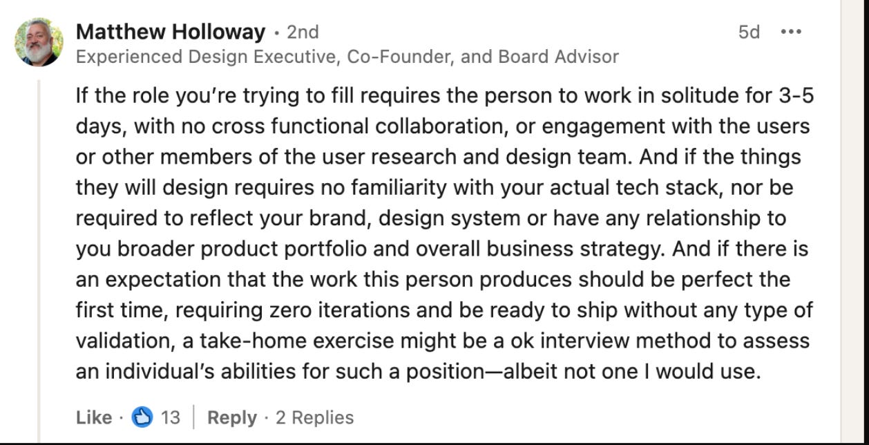 Sometimes the assignment is framed as a way to “see how you think and collaborate,” but in practice it feels like free work—work the company might use. It feels like an unfair way to make you perform under a microscope.
